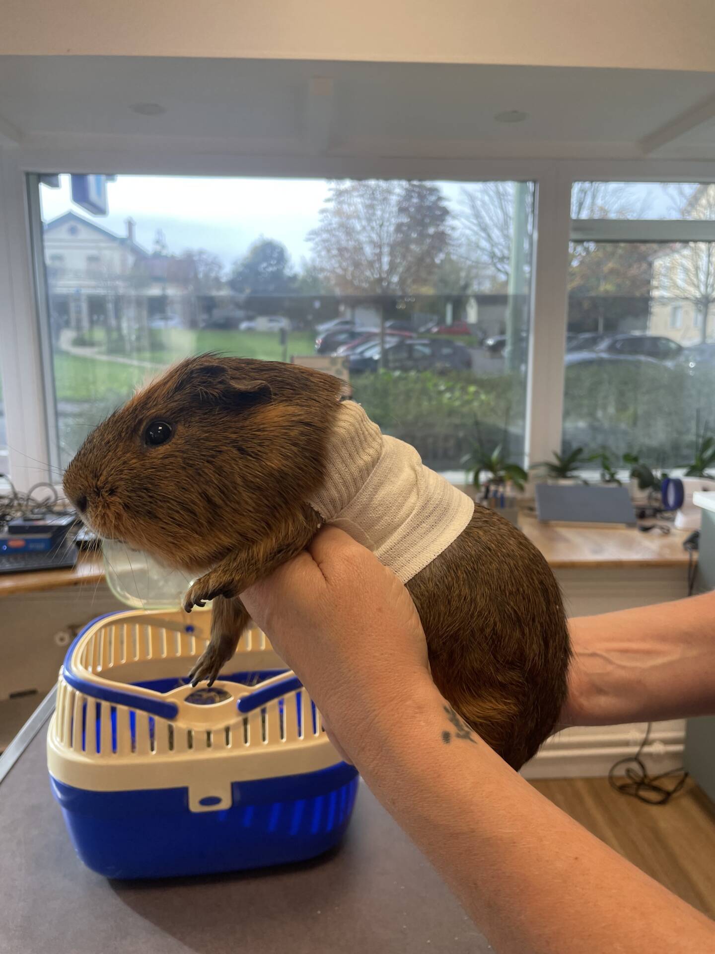 Notre petit patient cochon d’inde à été opéré d’une masse sur le flanc. Nous lui avons confectionné une sorte de tee-shirt pour ne pas qu’il touche à sa plaie🥰