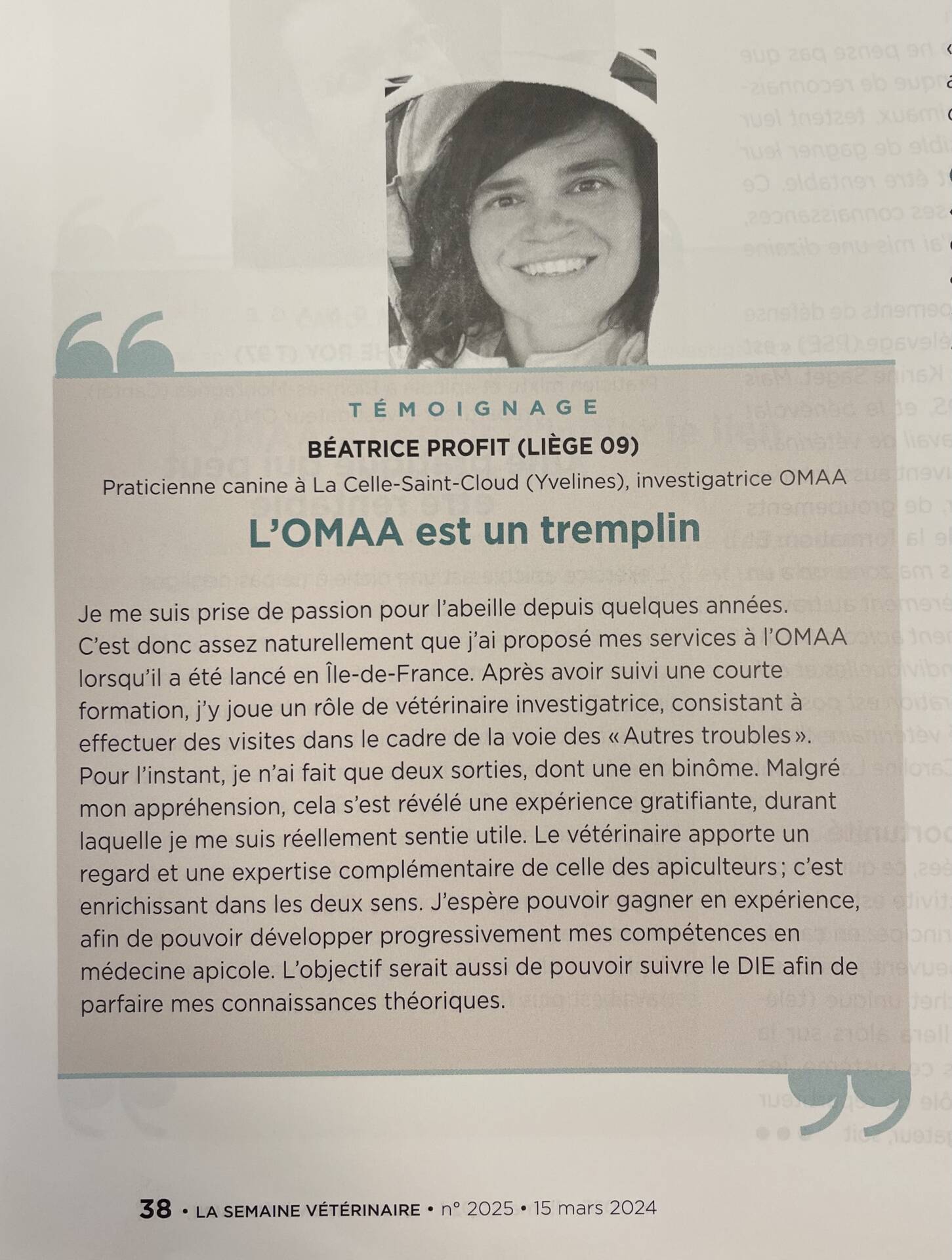 Nous sommes fières de vous partager le post que la revue professionnelle « La semaine vétérinaire » a publié sur ses réseaux sociaux.  Le Dr Profit a été interviewée au sujet de son expérience en tant que vétérinaire apicole au sein du réseau OMAA (Observatoire des Mortalités et des Affaiblissements de l’Abeille mellifère) dans leur magazine !